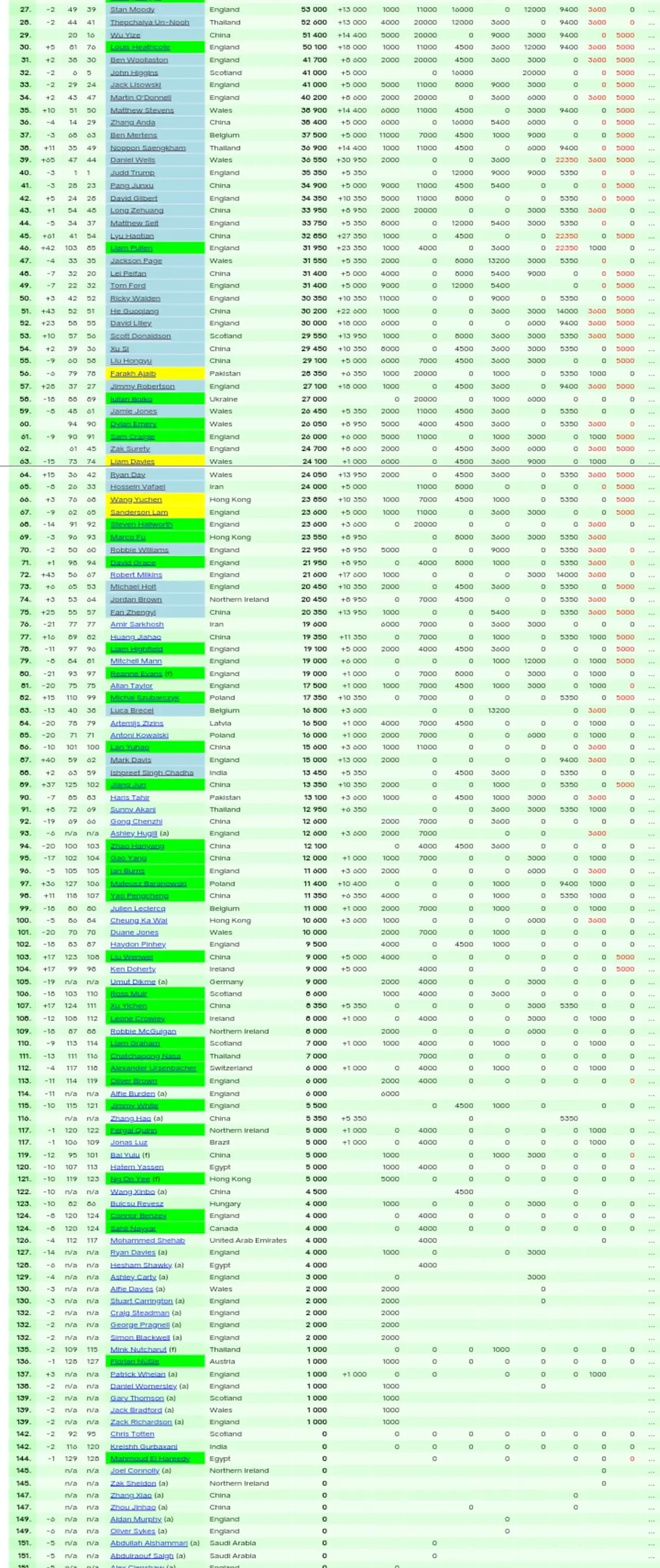 赵心童第6,作为新科世锦赛冠军,他在上海大师赛邀请赛晋级半决赛后就再也没有打进排名赛八强了,最好成绩是沙特阿拉伯大师赛16强。本站大比分2-5米尔金斯,止步64强,排名下降5位。同样遭遇正赛一轮游的还有世界第一特鲁姆普,下降3位来到第40。世界第6希金斯与世界第14张安达甚至都止步资格赛,分别下降3位与5位,来到第33与第37。