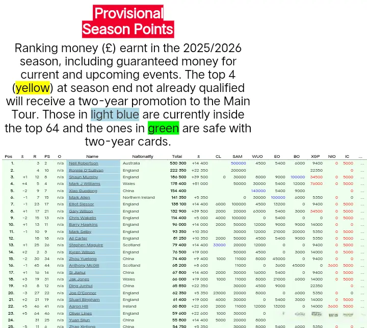 赛季排名之中国第一依旧是肖国栋,中国第二是周跃龙,本站不敌马叔止步32强,排名下降两位来到第15。中国第三是斯佳辉,本站在大比分0-3落后之下连扳三局,大比分3-5丹尼尔,止步32强,排名上升一位来到第17。
