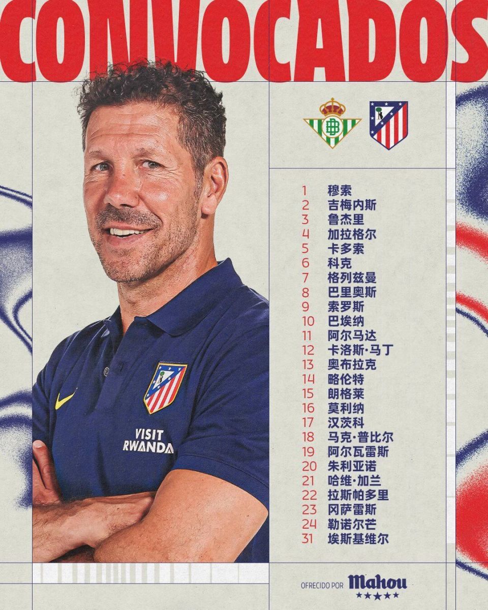 西蒙尼在赛前公布了球员大名单,随着卡多索的伤愈归队,马竞终于可以排出一套最完整的一线队阵容来应对强敌了。